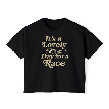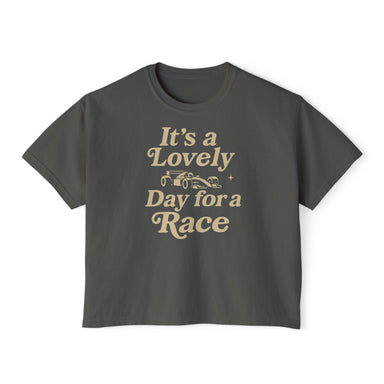 Make every day feel like race day with the Lovely Day for a Race Women’s Boxy Tee, featuring a bold Formula 1 car graphic and cheerful slogan. Desi...
